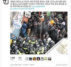 [향이의 SNS팡팡]“국민이든 야당이든 정책에 반대하면 개가 되는 거군” [향이의 SNS팡팡]“국민이든 야당이든 정책에 반대하면 개가 되는 거군” 경향신문 사회관계망서비스(SNS) 지기인 ‘향이’가 주간 SNS 화제 게시물들을 소개해드립니다. 또 SNS 이용자들의 반응도 함께 전해드립니다. ■바로 어제(22일) 벌어졌던 일입니다. 경찰이 철도노조 지도부 체포작전을 벌였습니다. 민주노총 본부에 사상 첫 공권력을 투입입니다. 민주노총이 입주한 경향신문사 정문 유리를 깨고 건물을 장악, 체포에 나섰지만 철도노조 지도부는 이미 건물을 빠져나간 것으로 전해졌습니다. 이날 경향신문사 건물 주변에는 경찰의 강제진입에 반발, 철도노조 파업을 지지하는 시민들이 모여들었습니다. 시민들이 건물로 가까이 오자 경찰은 이를 저지하며 최루성 물질인 캡사이신을 발사했습니다. 이 소식을 전한 뉴스를 본 .. 더보기 이전 1 ··· 116 117 118 119 120 121 122 ··· 307 다음