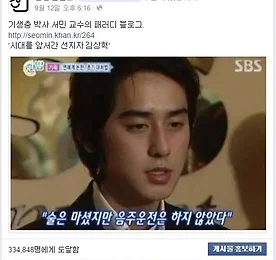 [향이의 SNS 팡팡]‘술은 마셨지만 음주운전은 아니다’ 패러디 봇물 [향이의 SNS 팡팡]‘술은 마셨지만 음주운전은 아니다’ 패러디 봇물경향신문 사회관계망서비스(SNS) 지기인 ‘향이’가 주간 SNS 화제 게시물들을 소개해드립니다. 또 SNS 이용자들의 반응도 함께 전해드립니다. ■지난 11일 댓글 작업 등으로 대선 개입 혐의를 받았던 원세훈 전 국정원장에 대한 1심 재판에서 법원은 국정원법 위반 혐의는 인정해 유죄판결 했으나, 선거법 위반 혐의는 무죄판결을 내렸습니다. “정치개입은 했지만 선거개입은 아니다”라는 판단으로 해석됐는데요. 이와 관련 누리꾼들 사이에서 수많은 패러디가 나왔습니다. 9년 전 음주사고를 낸 김상혁씨가 “술은 마셨지만 음주운전은 하지 않았다”고 해명한 것을 따라한 것인데요. 서민 교수도 블로그에 ‘시대를 앞서간 선지자 김상혁’이라는 풍자글을 게시했.. 더보기 이전 1 ··· 48 49 50 51 52 53 54 ··· 307 다음