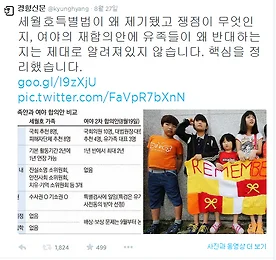 [향이의 SNS팡팡]"세월호 특별법, 일부 매체의 정보 왜곡 너무 심해" [향이의 SNS팡팡]"세월호 특별법, 일부 매체의 정보 왜곡 너무 심해"경향신문 사회관계망서비스(SNS) 지기인 ‘향이’가 주간 SNS 화제 게시물들을 소개해드립니다. 또 SNS 이용자들의 반응도 함께 전해드립니다. ■세월호 특별법에 대해 쏟아지는 정보량이 많다보니 ‘정말 꼭 알아야할 쟁점만 정확히 알려주는’ 기사가 필요했던 누리꾼들이 많았던 것 같습니다. 놀랍게도 지난주 트위터에서 가장 많이 재전송된 경향신문 기사는 ‘[세월호특별법 논란 재정리] 유족이 신뢰하는 ‘특검’이 강제수사 할 수 있게 법 만들자는 것‘ 이었습니다. 왜 특별법을 만들자는 것인지, 쟁점은 무엇인지, 왜 세월호 가족은 여야2차 합의안에 대해 반대하는지를 '짧고 굵게' 정리한 기사였지요. 이 기사는 트위터에서 1828회 재전송됐고 페.. 더보기 이전 1 ··· 50 51 52 53 54 55 56 ··· 307 다음