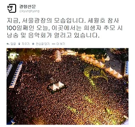 [향이의 SNS 팡팡] "세월호 참사의 진실이 가라앉지 않게 ... 함께 잡아야겠죠" [향이의 SNS 팡팡]"세월호 참사의 진실이 가라앉지 않게 ... 함께 잡아야겠죠" 경향신문 사회관계망서비스(SNS) 지기인 ‘향이’가 주간 SNS 화제 게시물들을 소개해드립니다. 또 SNS 이용자들의 반응도 함께 전해드립니다. ■세월호 참사 100일째였던 지난 24일 저녁 시청 앞 서울광장에서는 희생자 추모 시낭송 및 음악회가 열렸지요. 그날 밤, 촛불이 광장을 가득 메운 한장의 사진이 널리 전파되었네요. 트위터에서 2586차례 재전송됐는데요 누리꾼들은 주로 ‘참석하지 못해 미안하다’ ‘세월호 참사가 한국사회에 남긴 의미를 잊지 말자’는 짧은 글을 사진에 붙여 재전송하거나 댓글로 달았습니다. 트위터 이용자 Bu**********님과 su*********님 등은 “함께 자리하지 못해 미안합니다”라는 메시.. 더보기 이전 1 ··· 60 61 62 63 64 65 66 ··· 307 다음